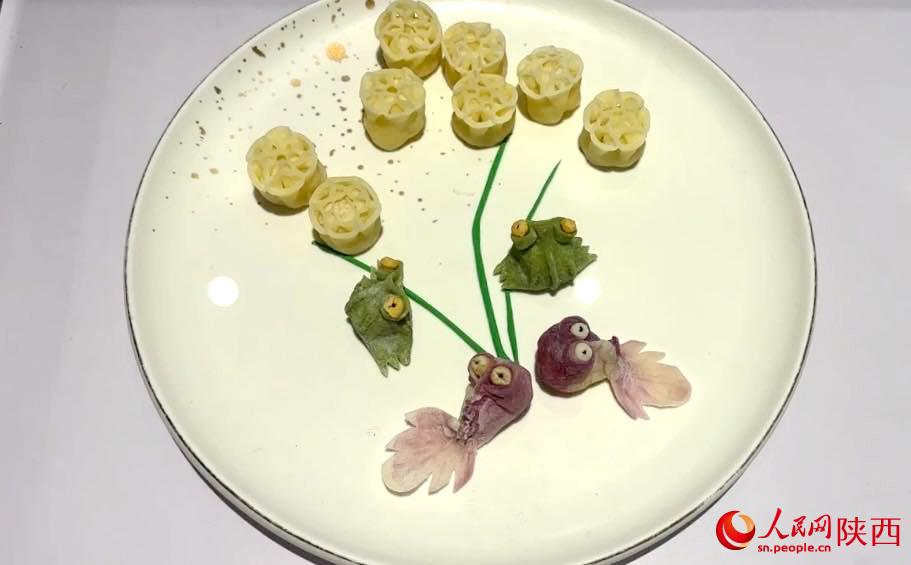 除了單獨的造型,把餃子組合起來就能制作成一幅畫,“荷塘月色”的造型分別取源于大唐芙蓉園荷塘里的金魚、蓮蓬和青蛙,既能讓客人品嘗到不同口味的餃子,同時還能了解到西安的文化。