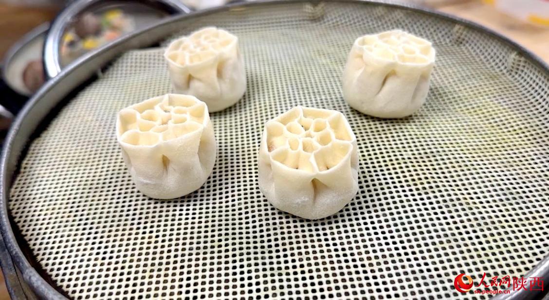 當(dāng)美食與文化結(jié)合,會碰撞出怎樣的火花?高珊手上動作不停,一朵“芙蓉”、一朵“石榴花”隨著她的手指翻飛逐漸變得栩栩如生?!啊鏊饺亍厦嬗?3個孔,代表著13個王朝曾在陜西建都,而‘百花迎賓’的形狀來源于西安市的市花——石榴花,表達(dá)的是對所有來賓的熱烈歡迎?!备呱航榻B道。